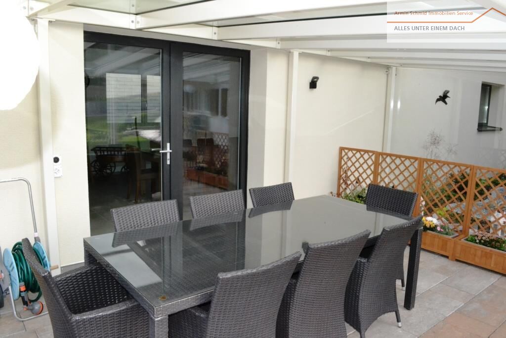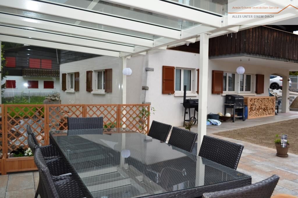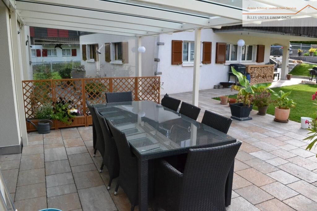 Zum Raum gehört auch ein gedeckter Aussensitzplatz und ein Grillring.